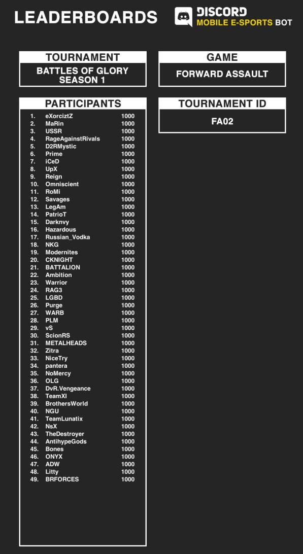 If a team finds their name on the list below, the captains can gain access to the #fa-tournaments chat room by typing the bot command /checkIn FA02 in #Bot-Channel. Teams that were selected were sent a confirmation message to their captains by the MOBILE E-SPORTS Bot through a Discord DM.