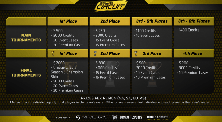 Each main tournament will start with 64 teams competing to qualify for the top in a 5vs5 single elimination bracket. Not only are you fighting for prizes and glory, but also for points that will be essential for you to be among the top teams that will make it to the Critical Ops Worlds Tournament.