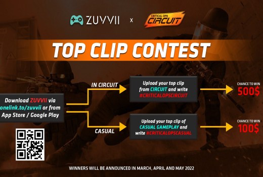 Critical Force & MOBILE E-SPORTS have teamed up with Zuvvii, a new video sharing platform, in order to introduce more prizes to the Critical Ops Circuit. At the end of February, March, & April, two top performance short clips will be selected and the players will be rewarded with a cash prize. The prize pool available is a total of $1800 with 3 Circuit participants getting $500 each & 3 casual players getting $100 each.